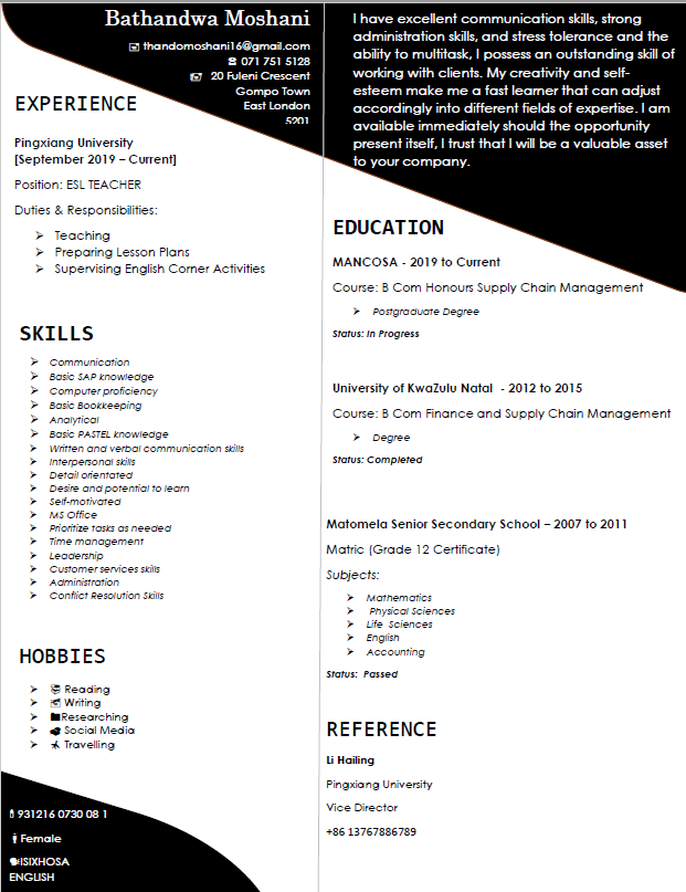 根据中外合作办学的教学要求,best365足球官网于2020年11月下旬为物流管理专业员工引进课程Logistics《物流学》),此次线上授课教师是Bathandwa Moshani老师。