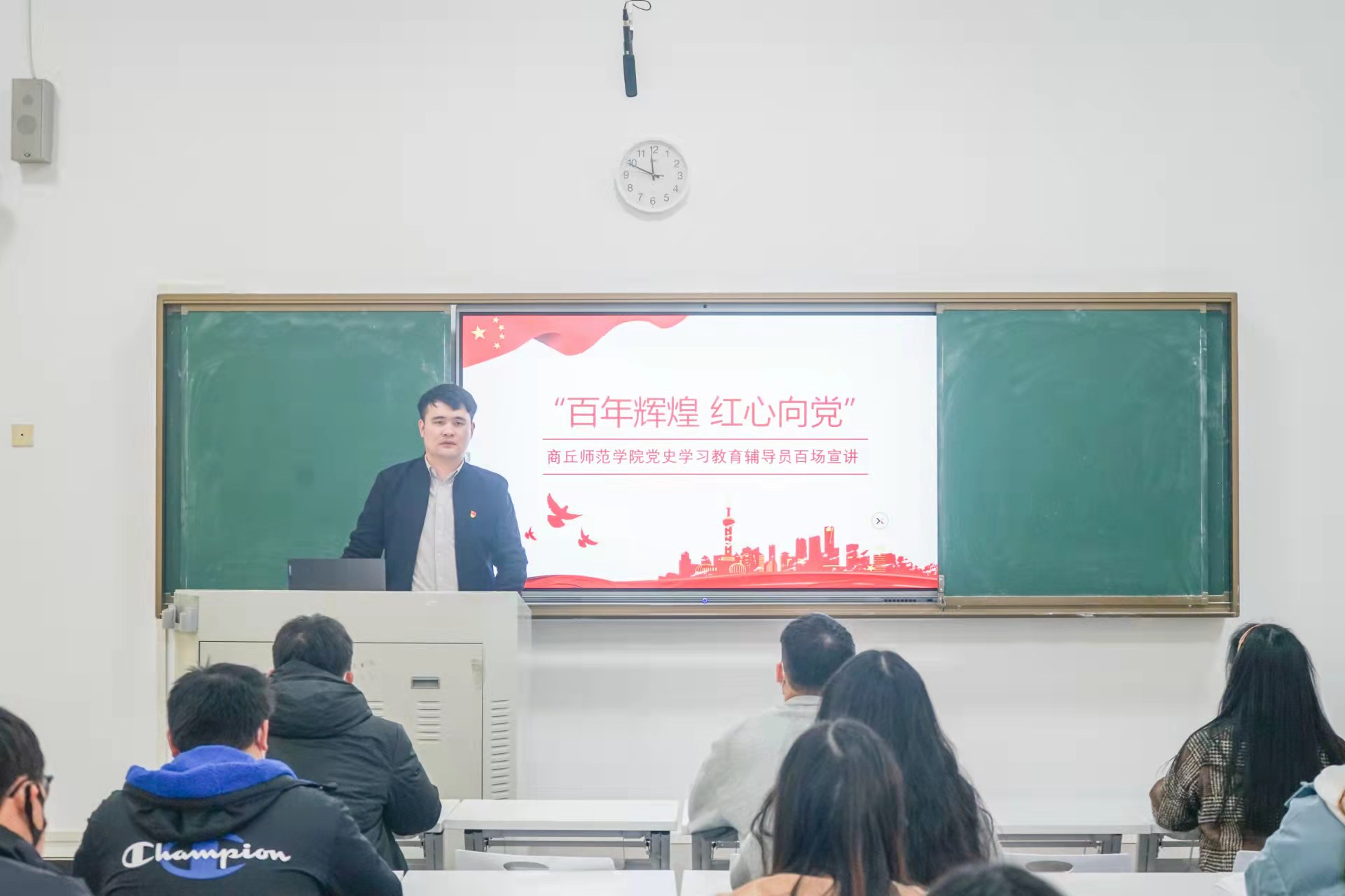 薛霁从星火燎原旌旗展开,开天辟地动功业成、百废待兴俱发展,改天换地创伟业、从改革开放春风来,翻天覆地创未来、大步迈入新时代,惊天动地向未来四个篇章向同学们解读了中国共产党百年征程的各个时期取得的伟大变化与成就。