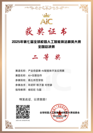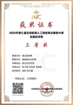 2025年12月,第七届国际青年人工智能大赛总决赛圆满收官,国家级获奖名单正式对外公布。该赛事由中国人工智能学会主办、联合国可持续发展目标全球协作项目工作委员会支持,是全球竞赛水平高、参与院校广的国际级青年人工智能高端赛事。在公司领导的悉心领导、跨学科导师团队等资源的精准赋能下,公司参赛最终斩获国家级三等奖2项。