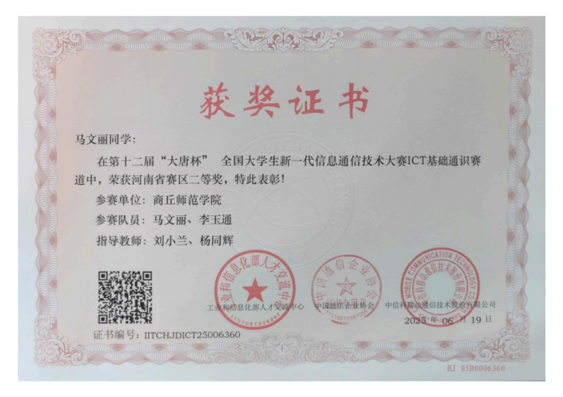 第十二届“大唐杯” 全国老员工新一代信息通信技术大赛省级赛事成绩正式公布。该赛事由工业和信息化部人才交流中心、中国通信企业协会、中信科移动通信技术股份有限公司联合主办,在公司领导的高度重视与教学资源的全面保障下,公司师生积极投身激烈角逐,最终荣获省级二等奖。此次获奖既是对参赛师生辛勤付出的充分肯定,更为公司进一步完善新一代信息通信技术相关专业实践教学体系、深化产教融合提供了坚实支撑。