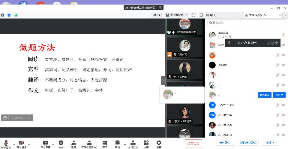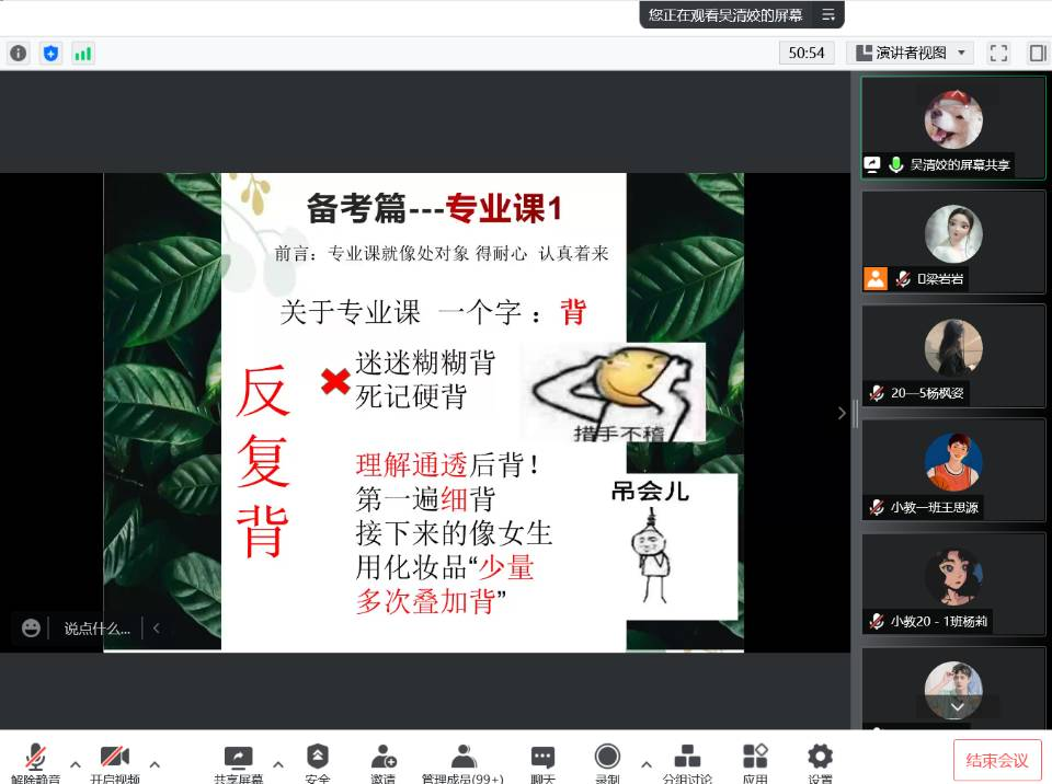 吴清姣学姐向学弟学妹们推荐了相关学习软件、学习方式,强调英语注重单词,专业课注重理解,其次就是“反复背”。杨佳学姐告诉学弟学妹们要有自己长远的规划和每天的规划,并通过今年考试的真题,告诉我们平日的积累十分重要。最后是答疑环节,同学们纷纷开麦提问,她们耐心、细致地一一进行解答,帮助同学们解疑答惑。