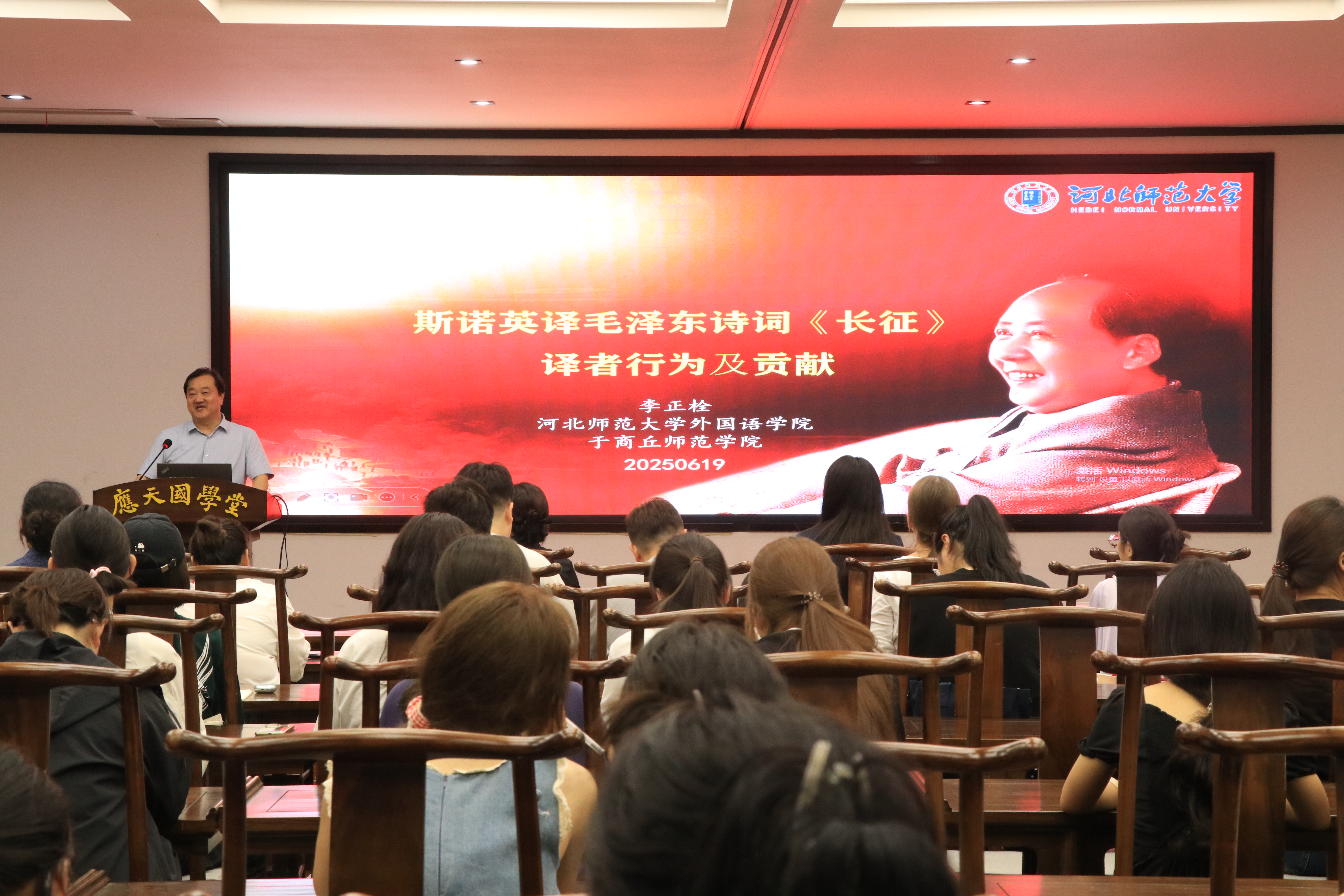 2025年6月19日,best365足球官网归德大讲堂第二期邀请河北师范大学李正栓教授在汉梁楼应天国学堂做了以“斯诺英译《七律·长征》的行为及贡献”为主题专题讲座。公司领导班子、全体教职工及员工代表参会。讲座由副经理杨静主持。