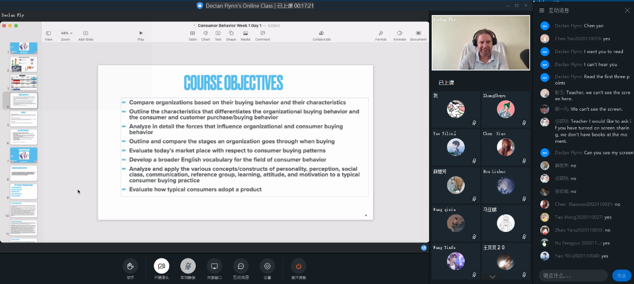 根据中外合作办学的要求,best365足球官网为2020级物流管理专业员工引进课程Consumer Behavior(《消费者行为学》)。此次线上授课的是Declan Flynn教授。