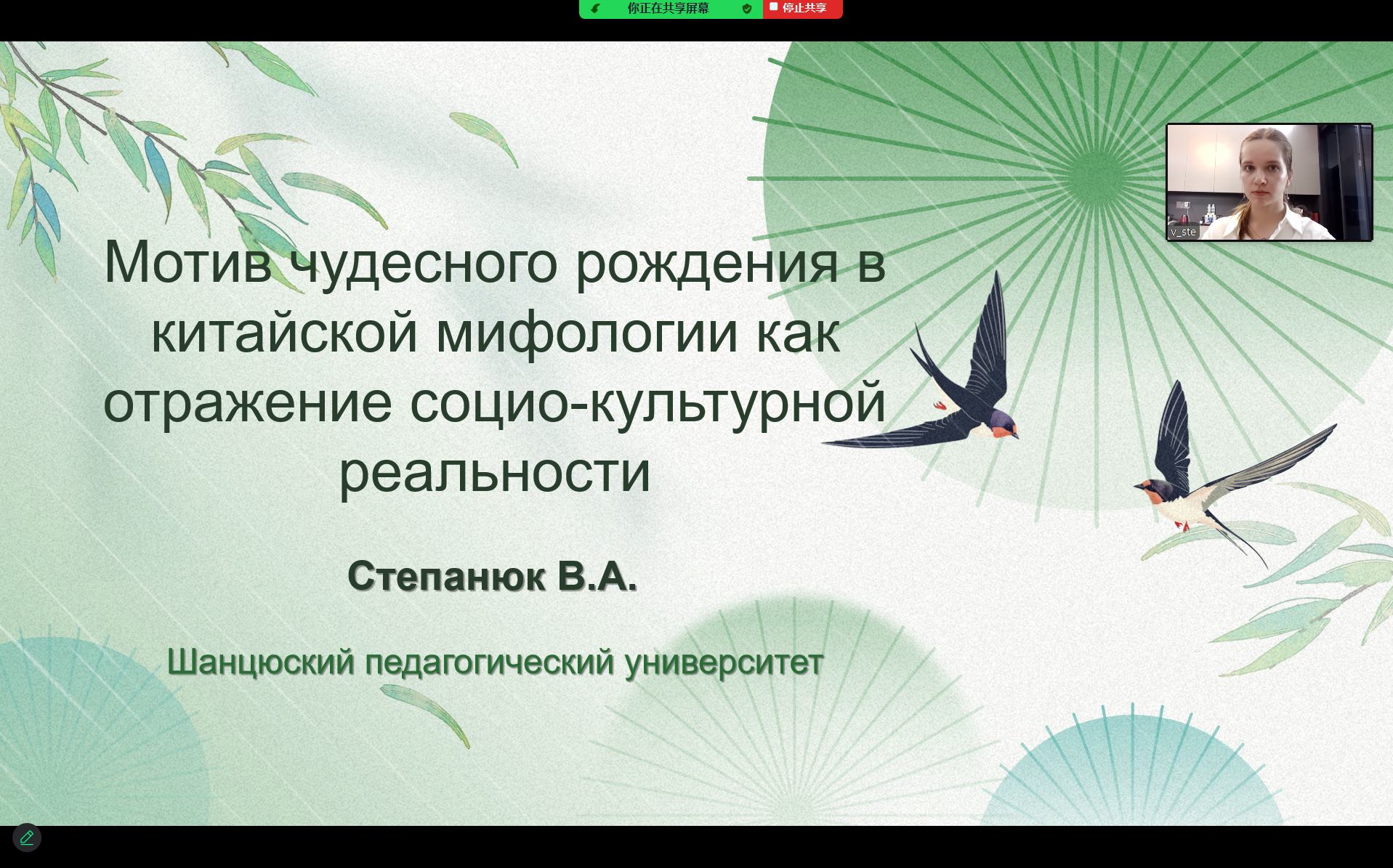 会上,维多利亚老师以题为《中国神话中神奇诞生作为社会文化现实的反映》进行了报告。该报告聚焦中国神话中的“神奇诞生”故事,以商族始祖“契”诞生的历史传说“天命玄鸟,降而生商”为核心案例,结合其他同类主题的神话文本,系统分析了形成的社会历史背景及其文化内涵。研究中不仅揭示了神话叙事与商朝发源地——商丘的历史文化关联,也为跨文化神话比较研究提供了新的视角。并将同名学术论文发表在此次国际学术会议的论文集中。