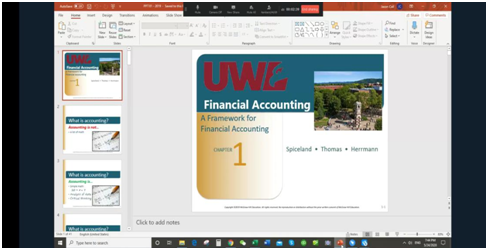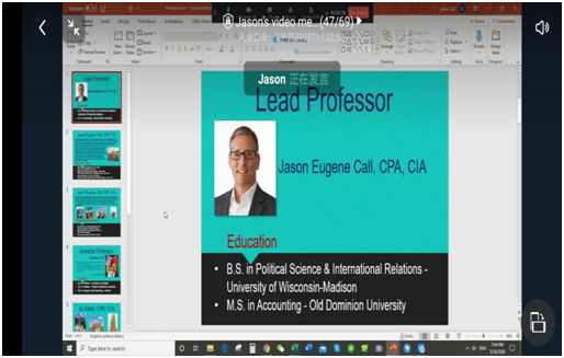 Jason 老师利用线上教学钉钉APP,为经济学的员工进行Financial Accounting在线教学。课堂上,Jason 老师,首先做了自我介绍,并且简单介绍了教学内容的安排。