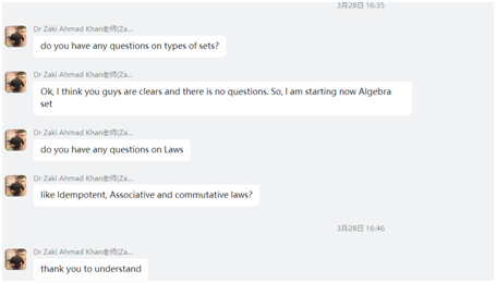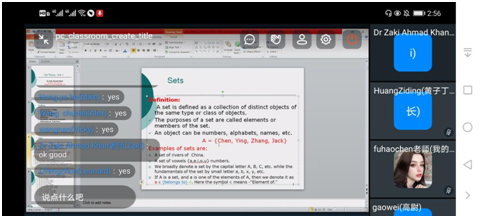 课堂上,Khan老师热情的为同学们讲述了数学集合论和逻辑学的重点,让同学们用英文领略了数学的另一种风采。老师和同学们积极互动,保证每一位同学能够充分融入课堂。