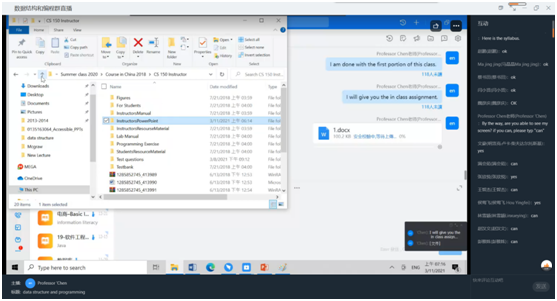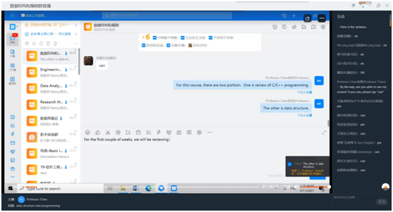 Chen老师利用线上教学软件,在钉钉平台上为软件工程的员工开展《数据结构与编程》教学。在课堂上,有着丰富教学经验的Chen老师用幽默灵活的教学方式进行授课,受到了员工们的欢迎与喜爱。