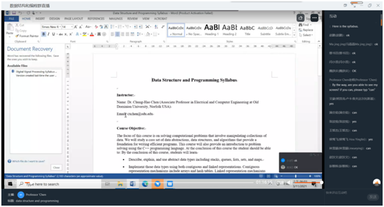根据中外合作办学要求,结合人才培养方案,为拓展员工国际视野,提高专业员工水平,best365足球官网与2021年3月为2019级软件工程专业员工引进课程Discrete Structure and Programming(《数据结构与编程》)。此次授课的老师是来自美国诺福克Old Dominion大学电气与计算机工程院系副教授Chung Hao Chen博士。
