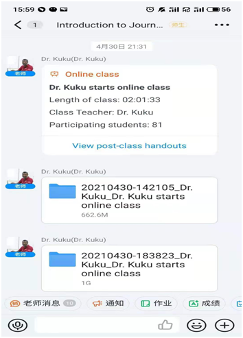 为了加深同学们对新闻学的了解,课后 KuKu老师向同学们发送本节课的课件和文档,帮助同学们进一步的学习。同学们也纷纷表示对KuKu老师的感谢,师生关系融洽。