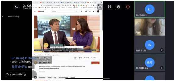 课堂上,同学们连麦开视频进行自我介绍,积极与老师互动,提出疑问并且回答KuKu老师的问题,与老师进行朋友间的交流,使课堂生动有活力。