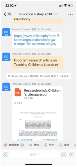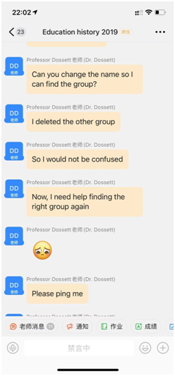 课上,Dossett老师幽默风趣,认真解答同学们的疑问,通过钉钉群组与同学们积极互动,拉近了老师和同学的关系。