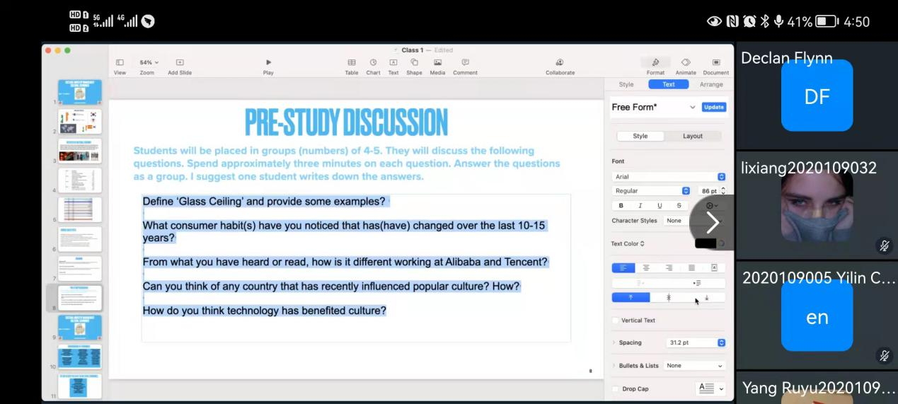 在第一节课上,Declan Flynn老师首先给同学们介绍了本次课程的进度要求以及考核标准。课堂上,Declan Flynn老师为了激发大家对课程的兴趣,用诙谐的语言介绍了文化经济学相关方面的有趣知识,并且用标准的发音给同学们讲解了这门课程在实际生活中的应用,使同学们全方位去深入了解“文化经济”,从而对这门课程产生了浓厚的兴趣。