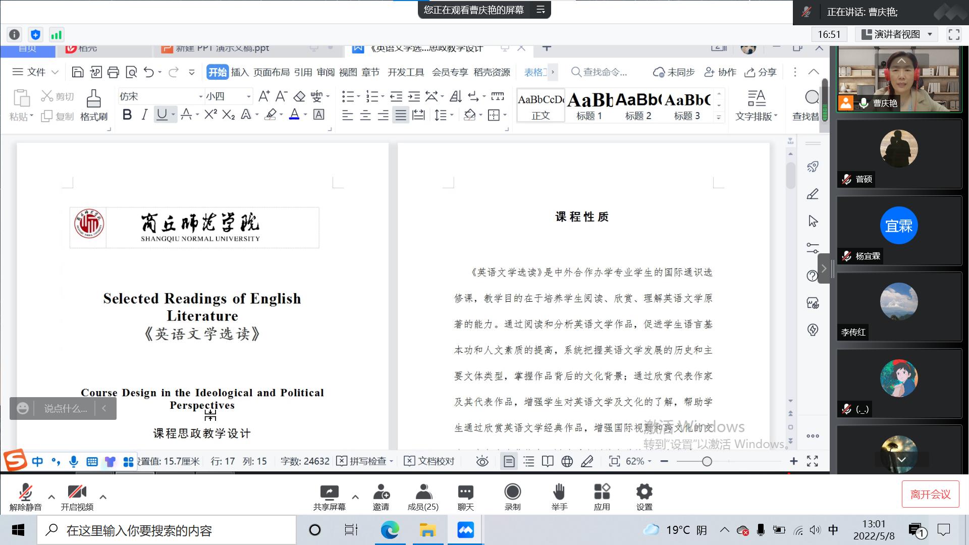 副经理曹庆艳强调了课程思政教学设计对于思政育人教学目标的重要性。她以《英语文学选读》课程为例,对教学设计的格式、课程思政教学目标的设定、每章节课程思政元素的挖掘和提炼,以及如何将课程思政自然融入教学内容四个方面向大家做了展示。