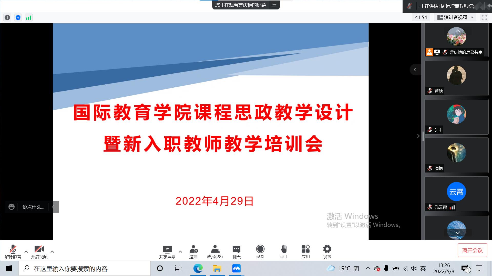 为落实立德树人根本任务、推进能力作风建设年活动、提高公司教师课程思政教学能力,和帮助新入职教师教学成长,2022年4月29日下午,公司以腾讯会议为媒介开展线上课程思政教学设计经验交流暨新入职教师教学培训会。会议由陈华书记主持,公司全体教师参加了此次会议。