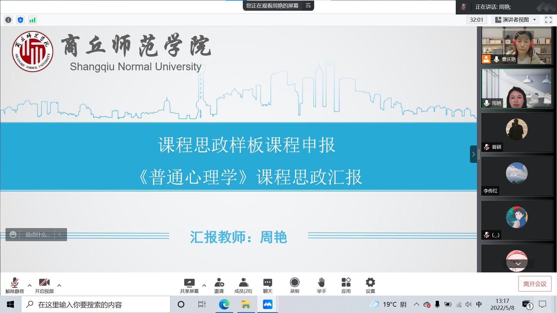 周艳老师以《普通心理学》课程为例从课程服务对象、课程性质、如何将课程思政目标框架渗透到每个章节,以及有机融入课程教学等方面做了分享。《普通心理学》课程获批2022年校级课程思政样板课程,周艳老师为该课程负责人。