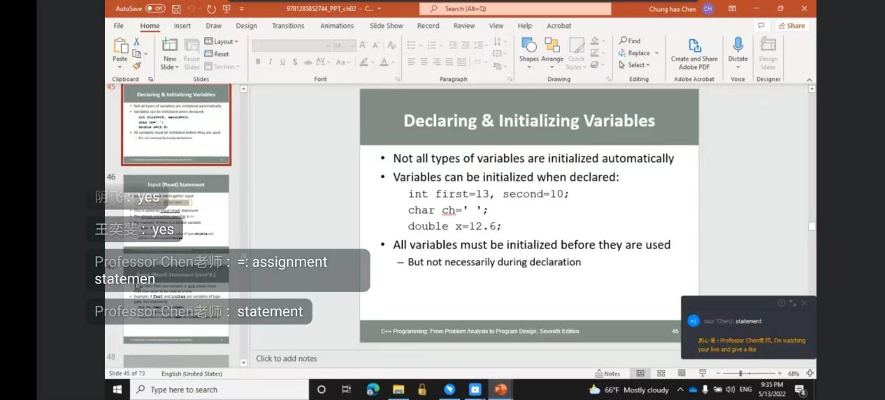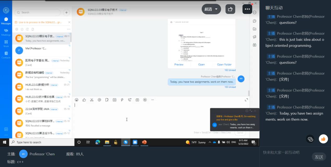课堂上,Chen教授发音标准,给同学们讲解了C语言的发展史,使同学们深入了解C语言并对此次课程产生了浓厚的兴趣。在直播教学中,Chen教授经常举一些通俗易懂的例子,及时为同学们答疑解惑。他的教学方式灵活、教学内容充实、知识点衔接紧密,由浅入深、重难点明晰。