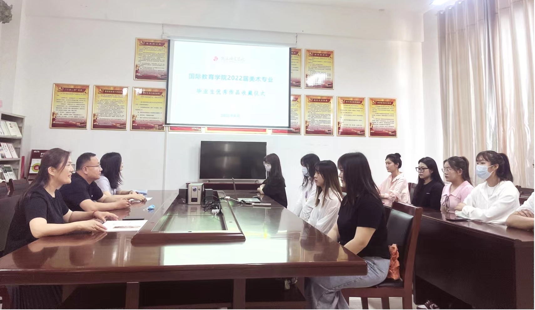 2022年6月2日,2022届美术专业毕业生作品展落下帷幕。经评选,10位毕业生的作品将由公司永久收藏。6月7日上午10点,收藏仪式在汉梁楼144室举行。公司领导班子,系主任孙娜和优秀作品获奖员工均出席了本次活动。收藏仪式由副经理曹庆艳主持。