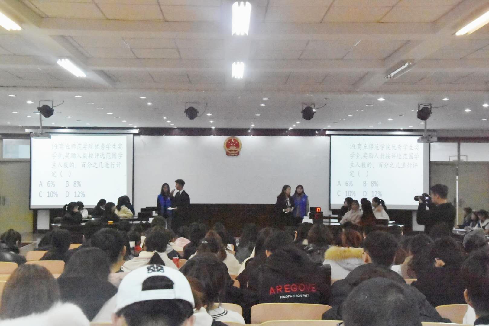 经过初赛、复赛的激烈角逐,共有12名同学一路过关斩将晋级决赛。他们分成六个小组,展开最后的巅峰对决。比赛分为扬帆起航必答题、一念之间可选题、谁与争锋抢答题三个环节。在扬帆起航必答题环节中,各队参赛选手平稳发挥;一念之间可选题环节,场上队伍强强较量;谁与争锋抢答题环节最为牵动人心,六支队伍不甘示弱,争先抢答,引燃全场;比赛期间还设立了“观众答题”环节:你画我猜,生动的表演形式引起观众的积极抢答,在增加比赛趣味性的同时也提升了观众的参与度,将现场气氛推向高潮。