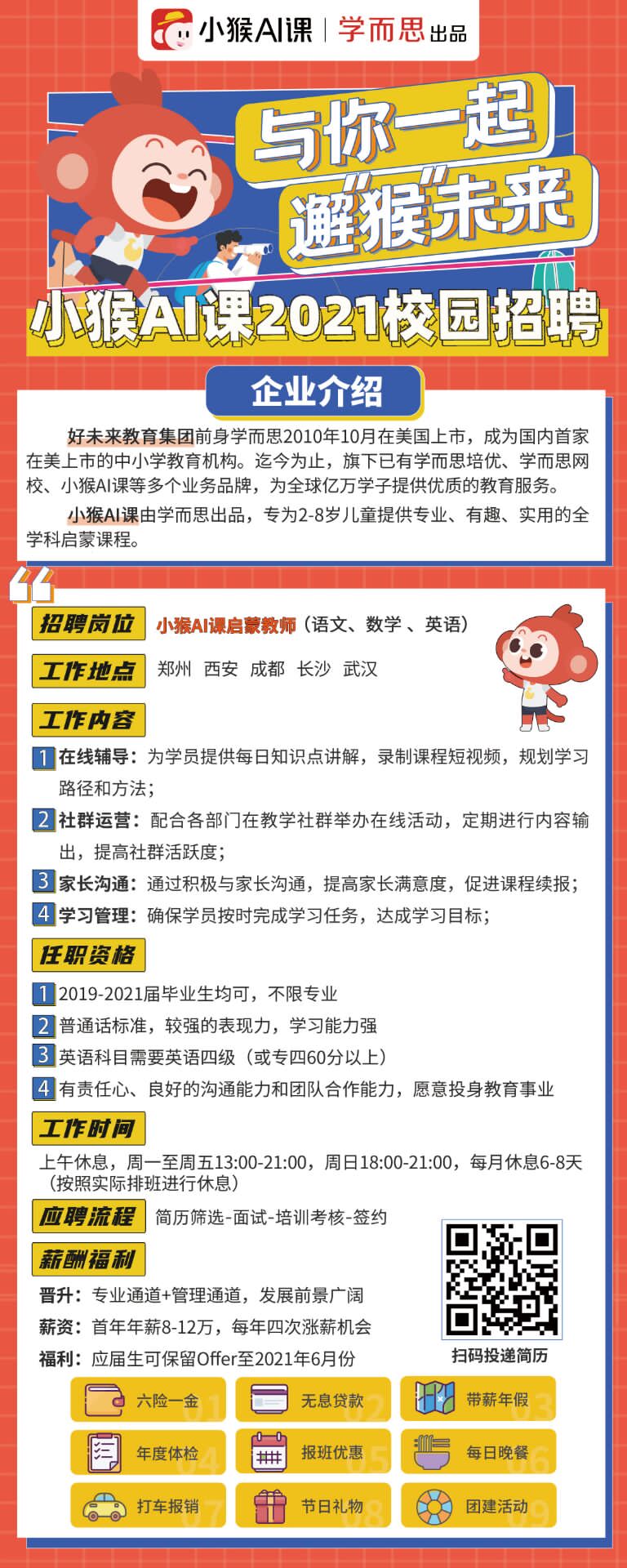 【岗位要求】本科以上(不限专业,四年制两年制均可,专科需要教育相关专业) 选择英语科目需要英语四级,语文数学不要求【投递方式】简历投递通道已经提前开启,可扫码线上投递也欢迎同学4月17日(本周六)前往校内双选会C区-4展位,进行现场岗位咨询及简历投递