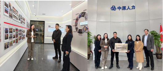 最后,在中原人力,董事长甘全占带领一行人员参观了公司发展历程、数字化人才服务中心及职业技能培训基地,并特别介绍了公司国际化战略布局及与高校合作的典型案例。
