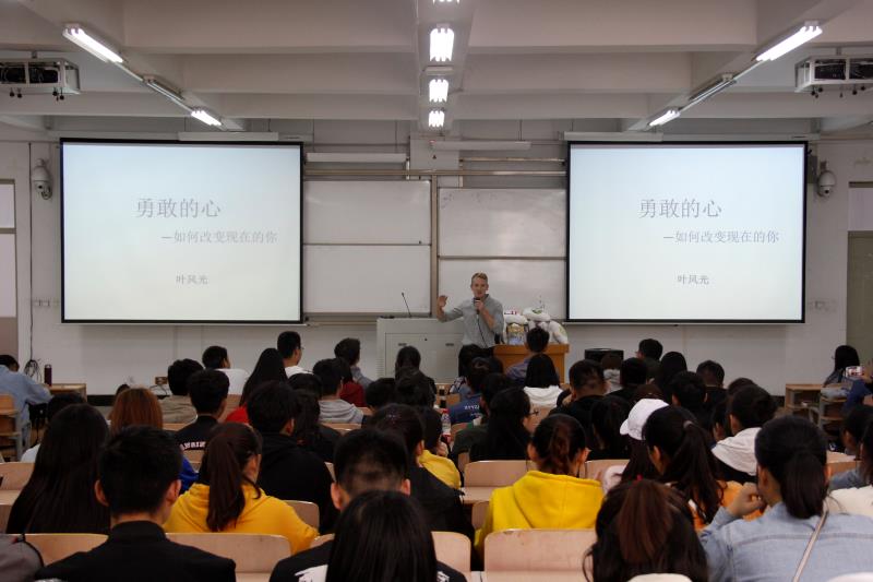 为帮助员工确立英语学习信心、勇敢追寻梦想,best365足球官网特邀美国TEFL教师/演员叶风光(Kenton L. V. Dunk)来公司做题为《勇敢的心——如何改变现在的你》的励志报告。10月26日下午三点在教学组团楼118教室,best365足球官网的员工代表汇聚一堂,副经理曹庆艳和辅导员老师们也来到了现场。
