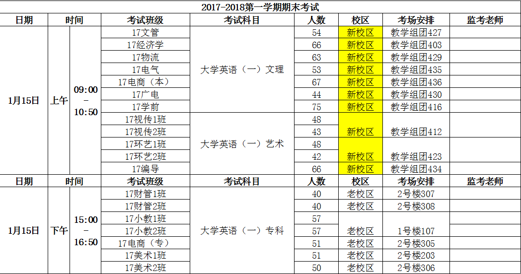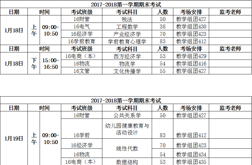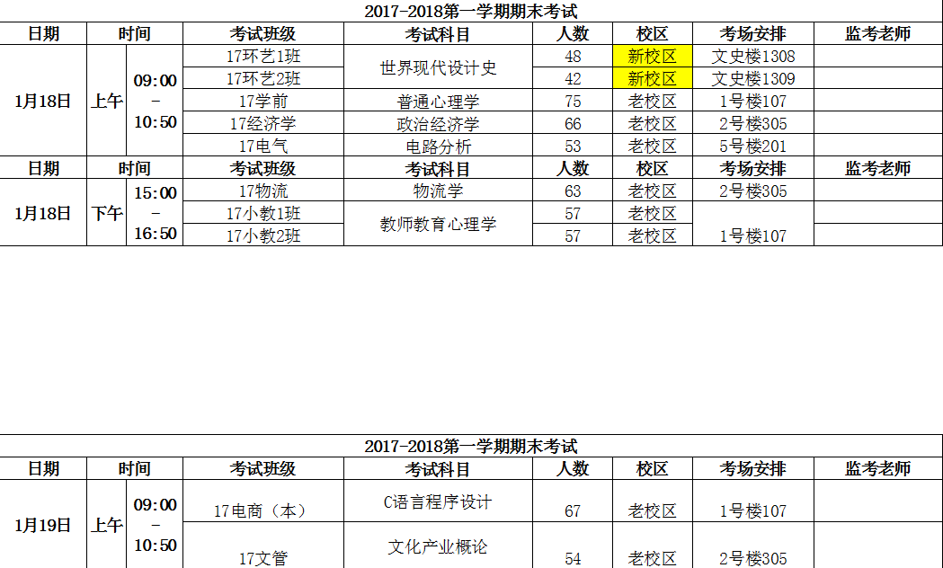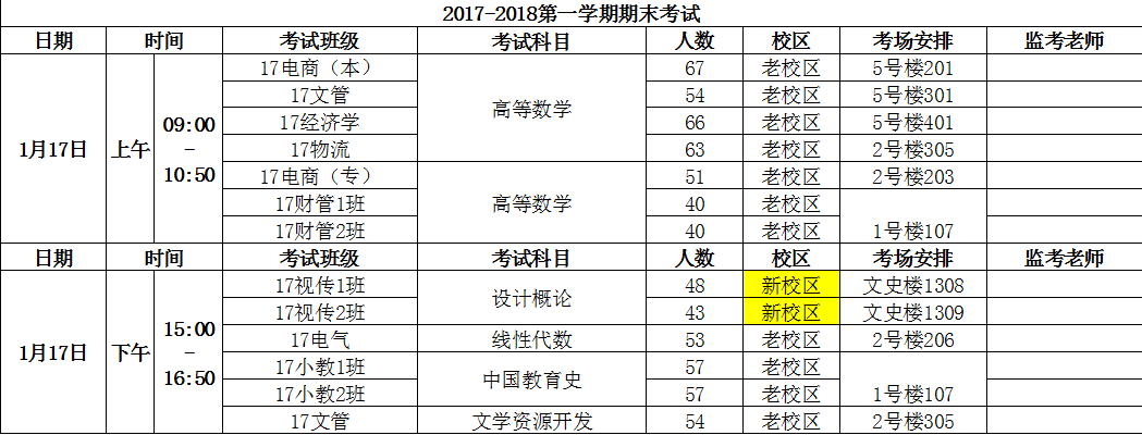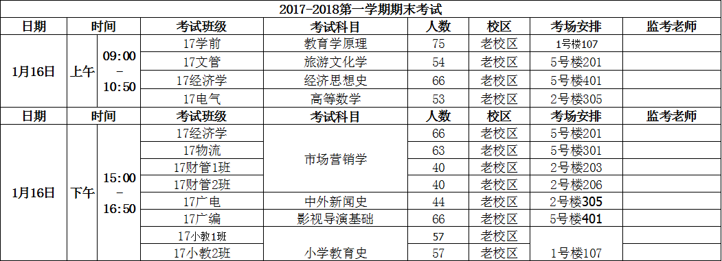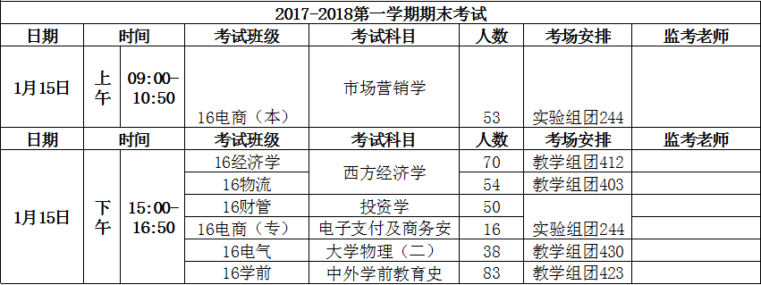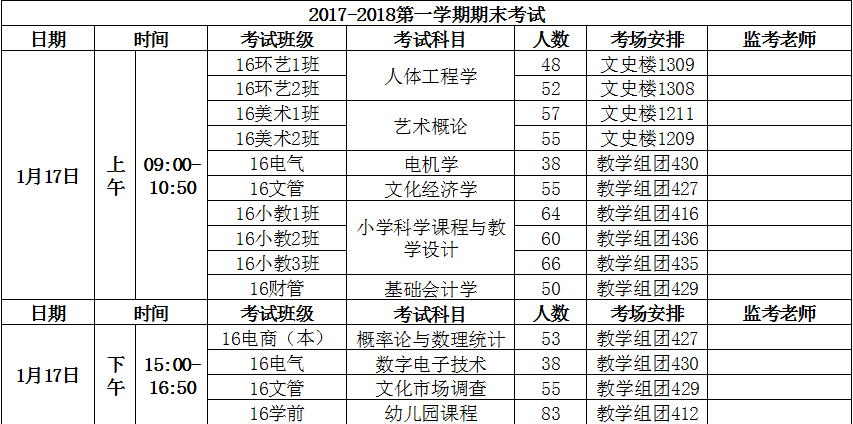 2017-2018第一学期期末考试 best365足球官网期末考试安排表