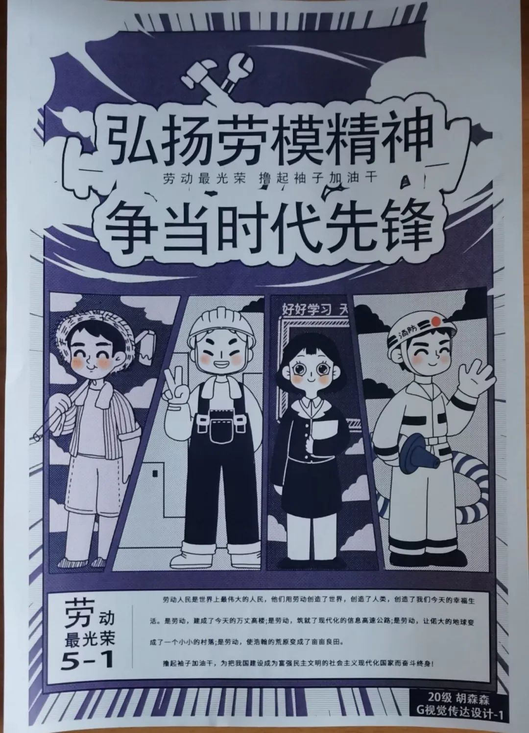 活动期间,同学们积极参与、热情好问、互相解答。她们将有关的劳动故事、诗词、名言以手抄报、海报等纸质形式体现出来,向同学们展现了劳动人民以及劳动精神,从而营造了劳动光荣的学习风尚。参赛作品设计美观、突出主题、排版整齐、图文并茂,也体现出了老员工的综合素质。