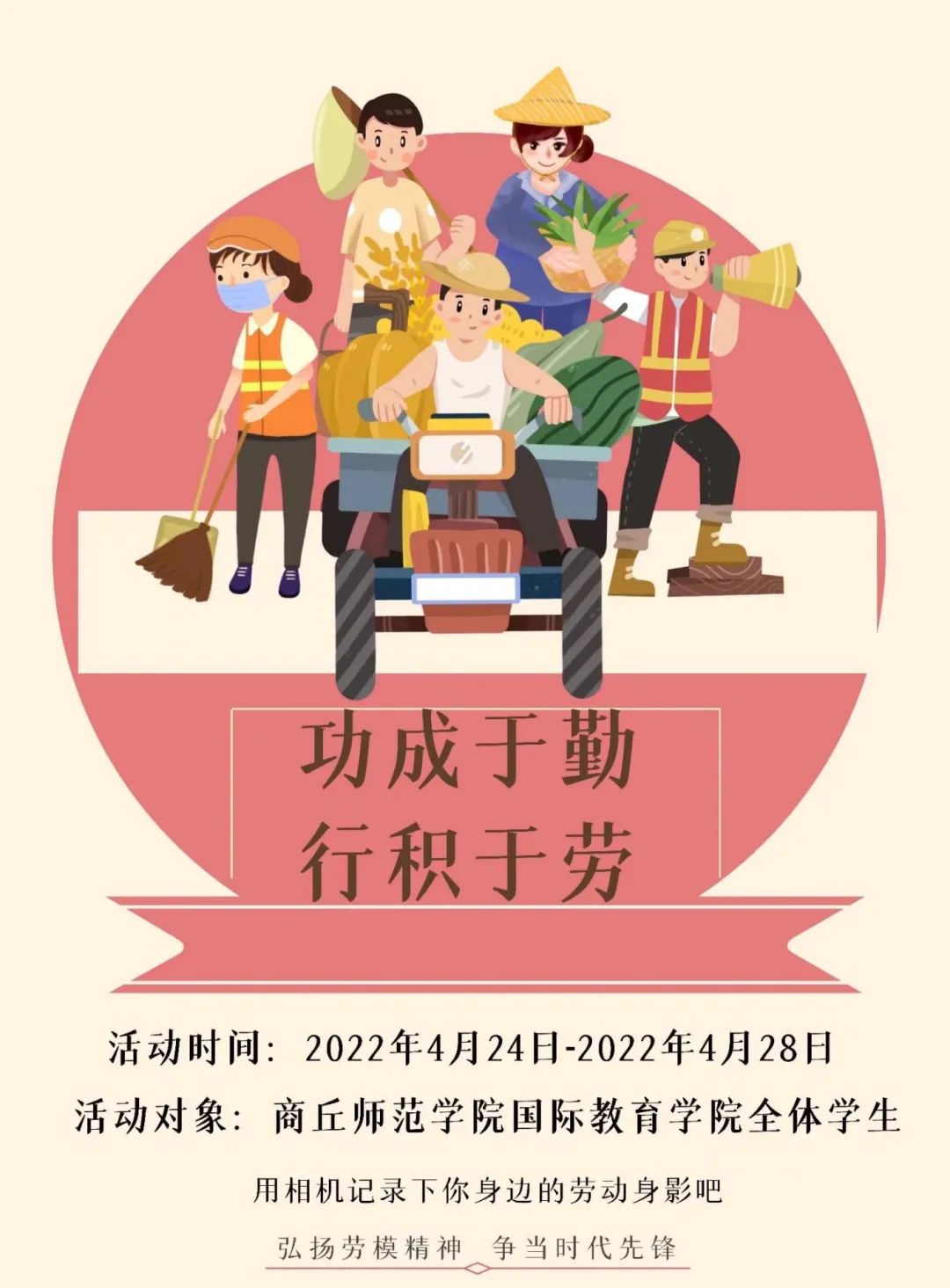 4月24日,该活动在线上举行,best365足球官网全体员工皆可参与,参与同学需拍摄best365足球官网校内各类劳动者的劳动照片(自身除外),并发表不少于50字对劳动精神的理解或劳动感悟到空间并@best365足球官网官方QQ,附有自己劳动时的照片,将截图上传至指定链接。参与本活动的同学均可获得1Pu学时。本次活动会评选出20份优秀作品,并将在27号宿舍楼best365足球官网办公区进行展示。