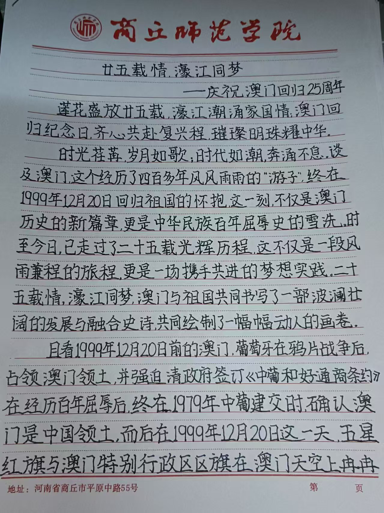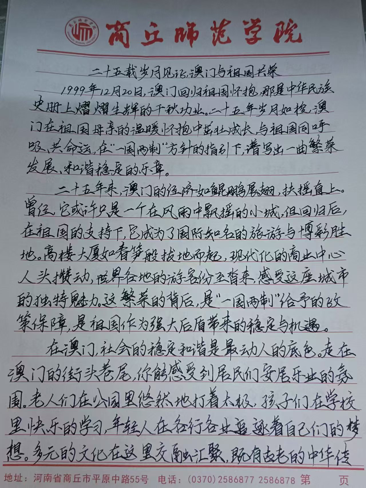 比赛期间,参赛同学们聚焦澳门的历史文化底蕴,着眼于澳门回归后的城市发展新貌,以笔为媒,描绘了对澳门更加繁荣发展的美好憧憬,抒发了对澳门回归二十五载光辉历程的深情礼赞。比赛结束后,办公室工作人员根据比赛细则评出了一等奖三名,二等奖四名,三等奖五名。