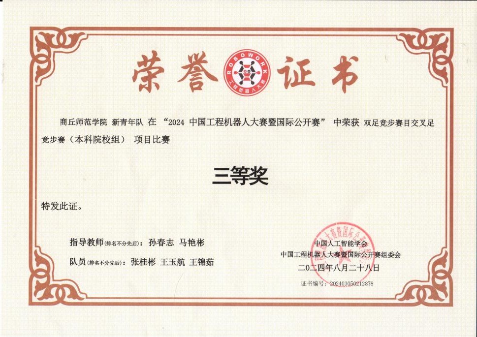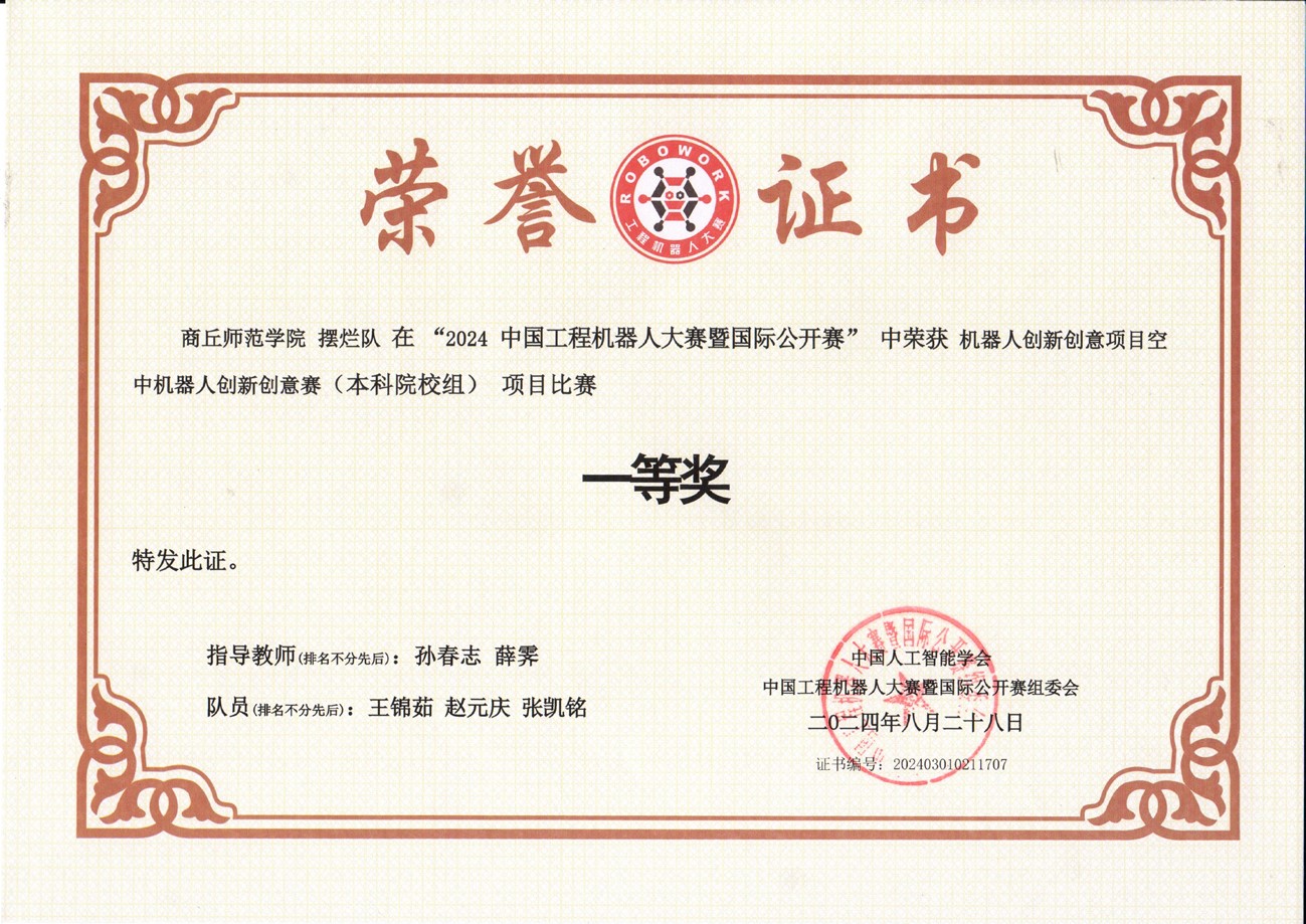 2024年8月,在中国创造协会、西安城市发展集团主办,中国人工智能学会认知系统与信息处理专业委员会等单位主办的中国工程机器人大赛暨国际公开赛中,公司同学积极备赛和参赛,最终获得全国一等奖和三等奖的优异成绩。